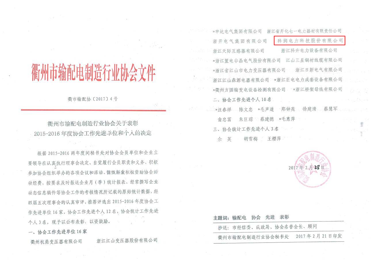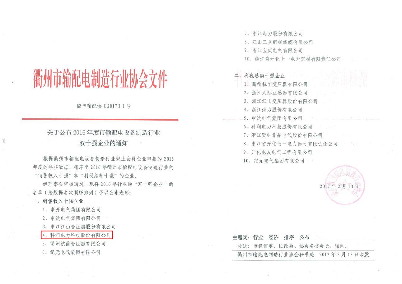 喜訊:恭賀公司榮獲衢州市輸配電制造行業(yè)協(xié)會年度工作先進單位、雙十強企業(yè)