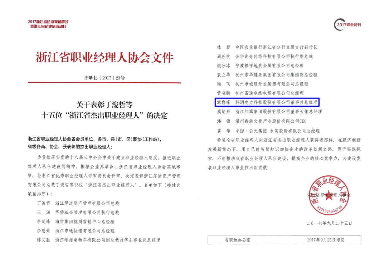 2017年度浙江省職業(yè)經(jīng)理人協(xié)會峰會暨一屆五次理事會議在杭州召開,會上揭曉了2017年度浙江省企業(yè)家“伯樂獎”5名、“杰出職業(yè)經(jīng)理人”15名、 “優(yōu)秀職業(yè)經(jīng)理人”25名。我司總經(jīng)理章群峰榮獲“浙江省杰出職業(yè)經(jīng)理人”。