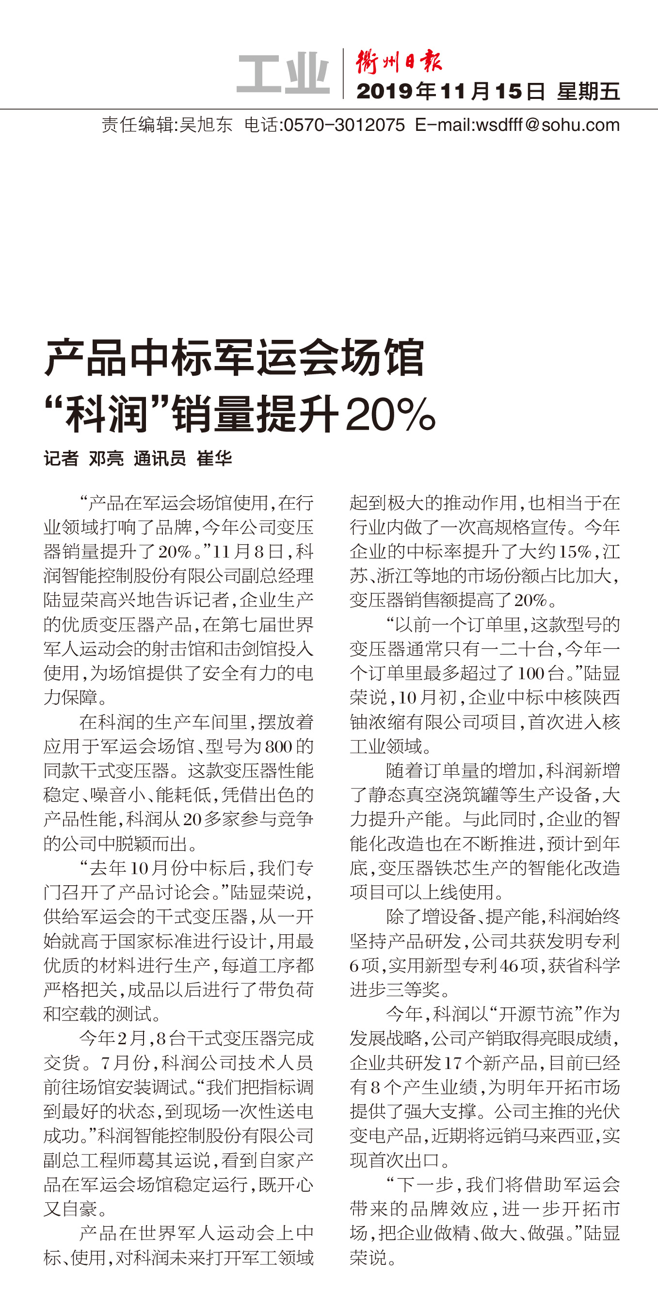 衢州日報上關于"產品中標軍運會場館 “科潤”銷量提升20%"的報道
