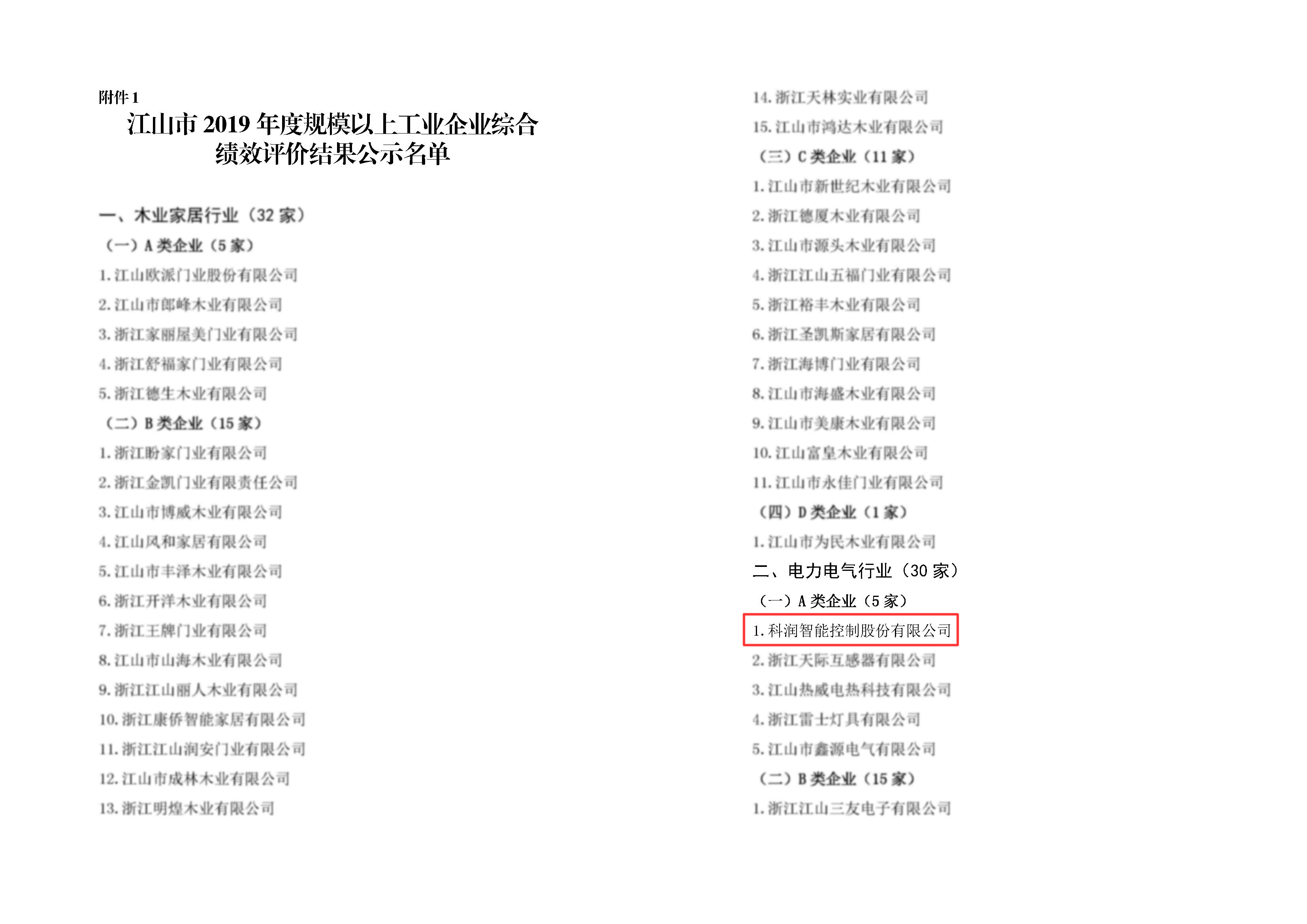根據(jù)《江山市工業(yè)企業(yè)“畝均效益”綜合評(píng)價(jià)辦法》,市畝均辦對(duì)2019年度全市719家工業(yè)企業(yè)開展了綜合績(jī)效評(píng)價(jià),我司位列江山市2019年度規(guī)模以上工業(yè)企業(yè)綜合績(jī)效評(píng)價(jià)電力電氣行業(yè)A類企業(yè)第一名。