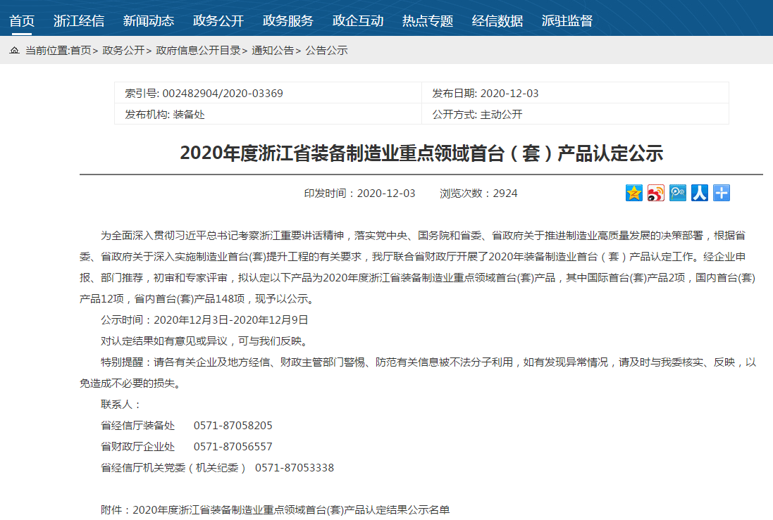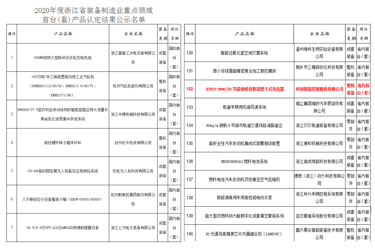2020年12月3日,2020年度浙江省裝備制造業(yè)重點(diǎn)領(lǐng)域首臺(tái)(套)產(chǎn)品認(rèn)定結(jié)果公示,我司的SCB13-2000/10節(jié)能低噪音智能型干式變壓器產(chǎn)品獲得省首臺(tái)(套)產(chǎn)品認(rèn)定。