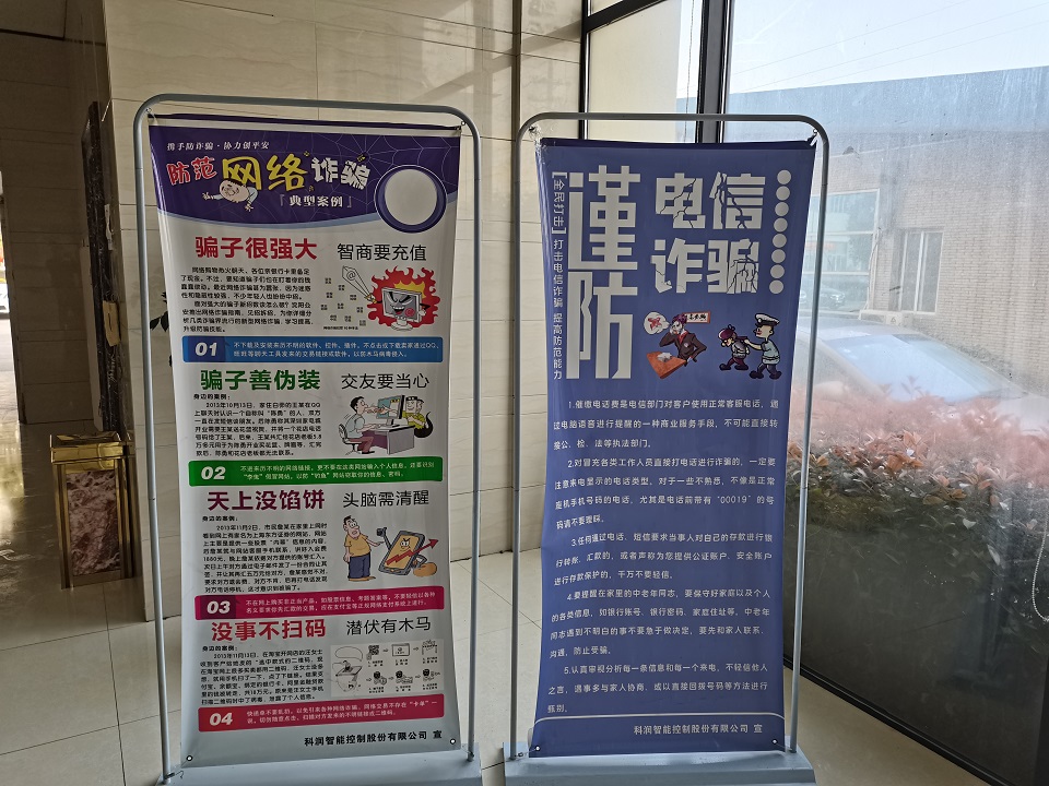 公司分別在公共區域和宣傳窗制作、擺放了防詐騙海報、橫幅、倡議書等,積極響應上級部門反詐騙宣傳,時刻提醒廣大員工提高防詐意識,避免財產損失。