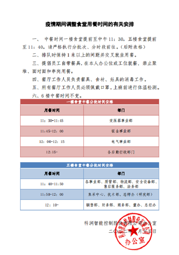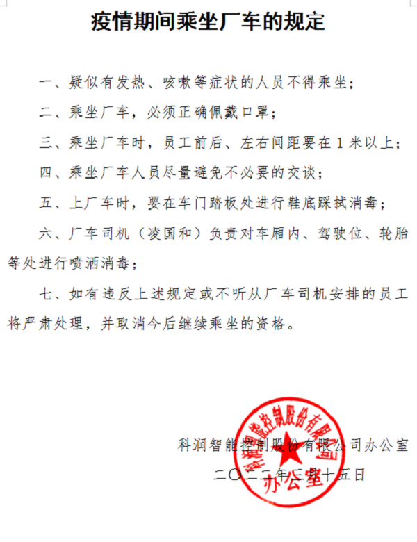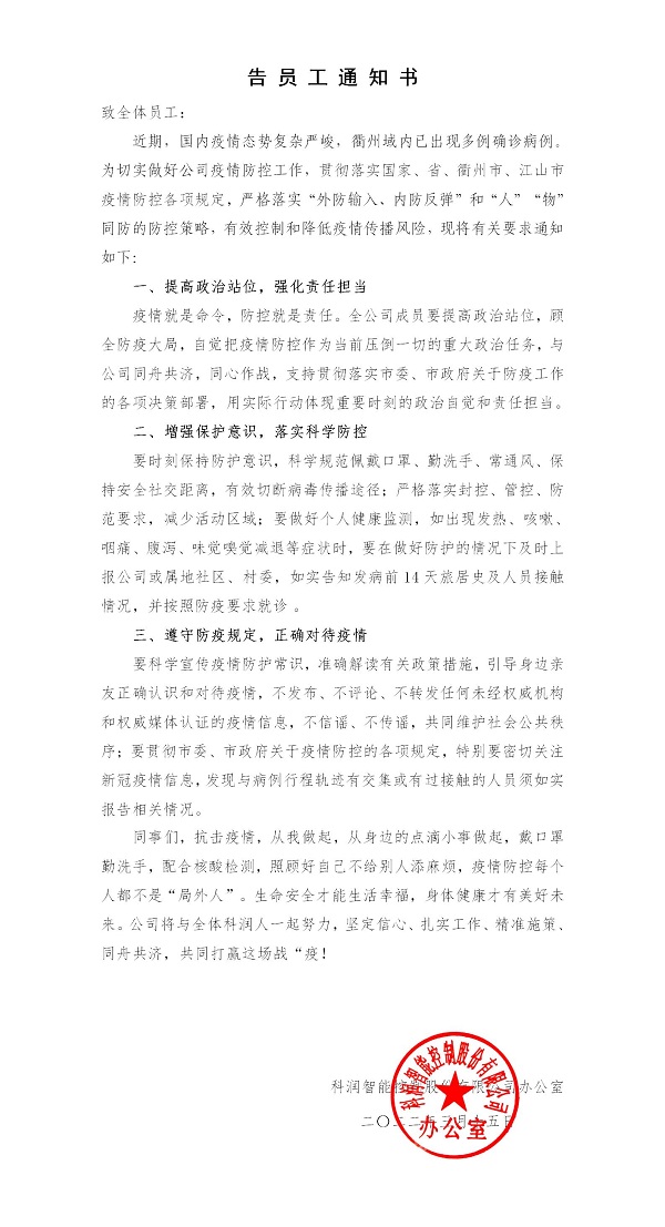 及時(shí)轉(zhuǎn)發(fā)衢州發(fā)布、江山發(fā)布等載體關(guān)于新型冠狀病毒防控常識(shí)、核酸檢測注意事項(xiàng)和最新疫情通報(bào)等,教育引導(dǎo)廣大員工以科學(xué)的態(tài)度認(rèn)識(shí)疫情,并發(fā)出告員工通知書,號(hào)召全體員工用實(shí)際行動(dòng),共同守護(hù)幸福家園,展現(xiàn)科潤智控全體員工的擔(dān)當(dāng)和力量。截止3月17日,公司全體員工已全部完成第一輪核酸檢測;對外來人員和車輛出入嚴(yán)格控制,要求正確佩戴口罩、掃碼、測溫、消毒、登記、查看48小時(shí)核酸報(bào)告;公司全域消毒;食堂錯(cuò)時(shí)就餐,排隊(duì)間距控制在一米等。