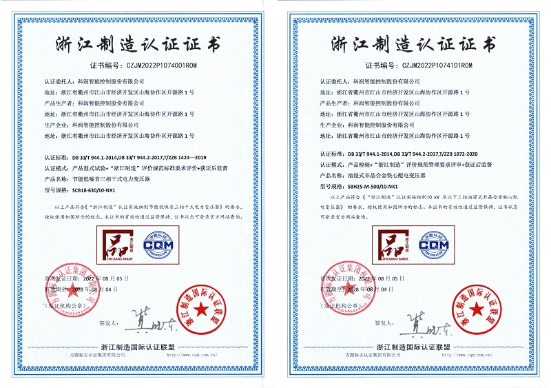 8月5日,科潤(rùn)智能控制股份有限公司的兩款產(chǎn)品----節(jié)能低噪音三相干式電力變壓器、油浸式非晶合金鐵心配電變壓器獲得“品字標(biāo)浙江制造”認(rèn)證。